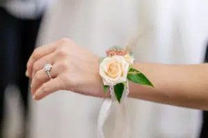 Pour le bracelet, nos fleuristes ont travaillé en collage avec une jolie rose branchue pêche, quelques feuilles de ruscus d’Italie et de pampa sur un ruban blanc, pour un accord parfait avec votre bouquet et les centres de table.
