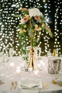 L’arche naturelle habillée d’eucalyptus, de ruscus d’Italie et de pampa scintille elle aussi, dans le même esprit que le décor ambiant grâce à une jolie guirlande lumineuse. Aux pieds de celle-ci, Florence a disposé du feuillage séché, des tiges de pampa et de l’eucalyptus cuivré dans de ravissantes dames jeannes. Pour rester en harmonie avec le thème romantique et champêtre du mariage, elle a voulu créer une ambiance naturelle et pleine de douceur.