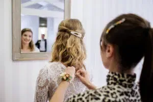 Notre mariée s’est faite maquiller et coiffer par M’toi. Mentionnons que Marine met tout son cœur à l’ouvrage pour accompagner ses clientes avec passion et bienveillance. Vous êtes choyée et pomponnée dans une ambiance douce et conviviale. Entre ses mains expertes, la mise en beauté se transforme en un moment unique qui n’appartient qu’à vous. Définissez ensemble le maquillage et la coiffure qui vous mettront en valeur. Vous êtes plutôt smoky eyes ou maquillage frais et léger ? Cheveux lâchés ou attachés ? Vous pouvez lui faire confiance les yeux fermés ! Vous sublimer juste avant de revêtir la robe de vos rêves, c’est son métier. Pour les amoureuses des accessoires fleuris, notre équipe saura vous conseiller : peigne fleuri, broche ou couronne, tout est possible !