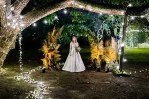 Mademoiselle Loyal a donc jeté son dévolu sur le Domaine de Valmont, un lieu empli de charme et avec une identité qui lui est propre. Cet environnement verdoyant au cœur de la campagne est à la fois calme et reposant. Notre équipe est également tombée en amour pour ce lieu envoûtant grâce à son grand parc mais aussi sa fontaine, sa bambouseraie, et les multitudes de possibilités pour y installer une salle de réception en extérieur notamment. Romain de Sono d’ary, a d’ailleurs réalisé une incroyable mise en scène avec son rideau de guirlandes lumineuses que vous pouvez choisir d’installer en intérieur comme en extérieur. C’est comme une pluie d’étoiles qui entourait de manière féérique et étincelante notre salle de réception à ciel ouvert ! Les centres de table réalisés par notre team prenaient alors une dimension hors du temps.